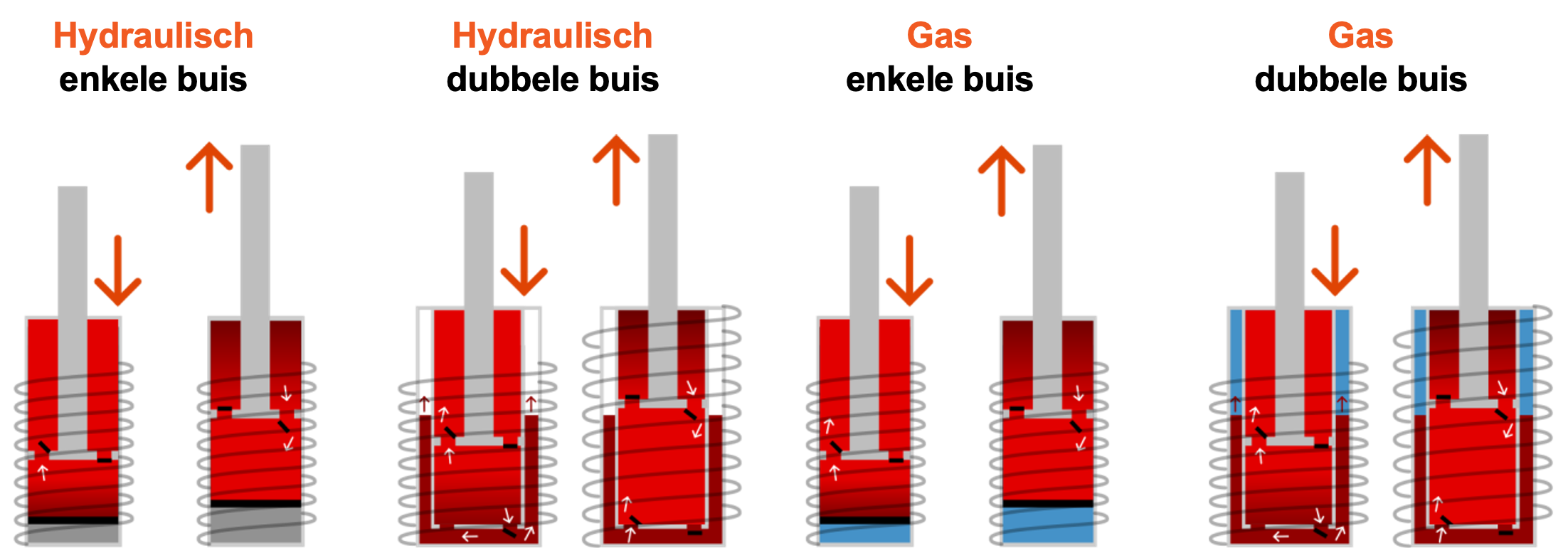 Onze schokdempers zijn uitgerust met twee buizen (de ene extern, de andere intern), waarin een zuiger hydraulische vloeistof verplaatst om de veerbewegingen te regelen. Het stikstofgas staat onder druk om de vorming van luchtbellen te voorkomen. Dat verlengt de levensduur van de schokdemper en zorgt voor een constante respons, zelfs op slechte wegen.